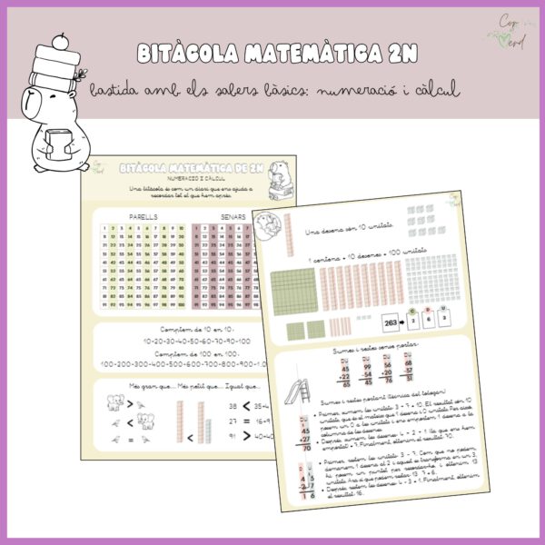 Una bitàcola és com un diari que ens ajuda a recordar tot el que hem après. Amb aquesta bitàcola matemàtica de 2n sobre numeració i càlcul, els infants podran recordar, repassar i resoldre reptes matemàtics amb una bastida completa i visual: parells i senars; més gran, més petit i igual que; comptatge de 10 en 10 i de 100 en 100; unitats, desenes i centenes; i sumes i restes sense portar i portant-ne.