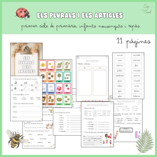 Recurs didàctic per aprendre i repassar el singular, el plural i els articles en català mitjançant activitats lúdiques i manipulatives. Inclou fitxes, jocs com el memory, exercicis de retallar i completar paraules, i la pràctica de les regles ortogràfiques bàsiques. Afavoreix l’ús correcte dels articles segons gènere i nombre i fomenta un aprenentatge actiu i significatiu, especialment útil per a l’alumnat de primer cicle, nouvingut o amb reforç lingüístic. També, teniu el document en lletra d’impremta amb algun exercici diferent.