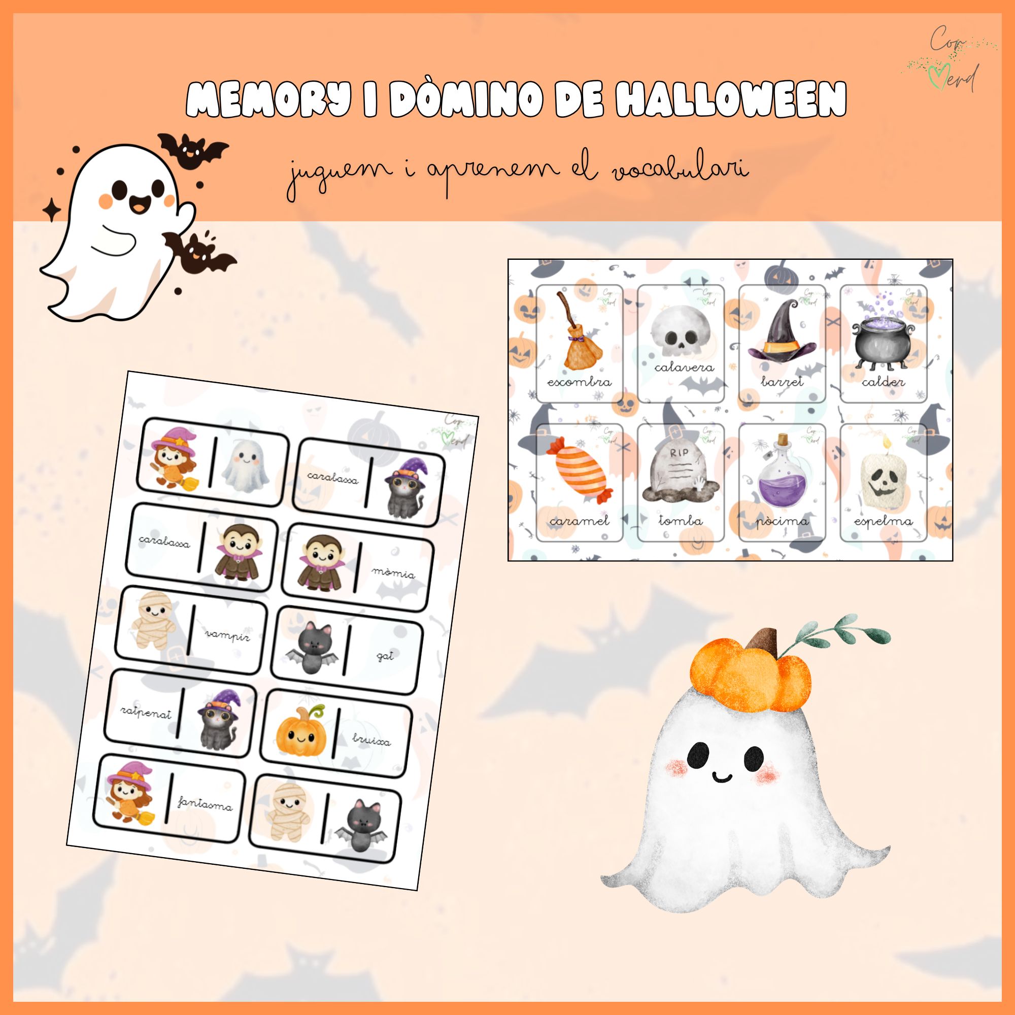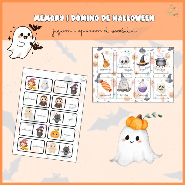 Aquest recurs inclou dues activitats lúdiques per treballar el vocabulari relacionat amb Halloween. D’una banda, es proposa un joc de memory amb imatges i paraules clau del vocabulari de Halloween, amb l’objectiu de reforçar la comprensió i la retenció del lèxic de manera visual i divertida. D’altra banda, comparteixo amb vosaltres un dòmino de paraules i imatges, pensat per afavorir la lectura i la identificació de les paraules treballades.