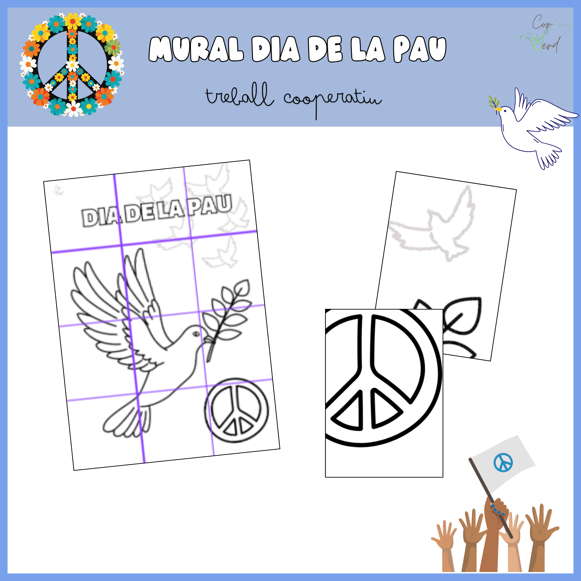 Us presento una dinàmica grupal per fer pel dia de la Pau. Un mural de 12 fulls A3 per decorar-lo com més ens agradi.